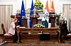 Vertreterinnen und Vertreter Indiens und der EU bei der feierlichen Verkündung und Unterzeichnung des Abkommens.European Union